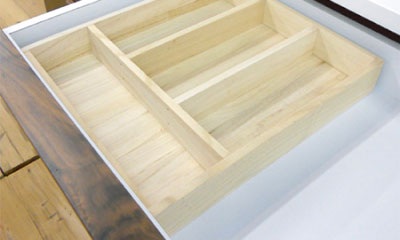 引出しにはスプーンやフォークなどの収納に便利な木製トレーが入っています。